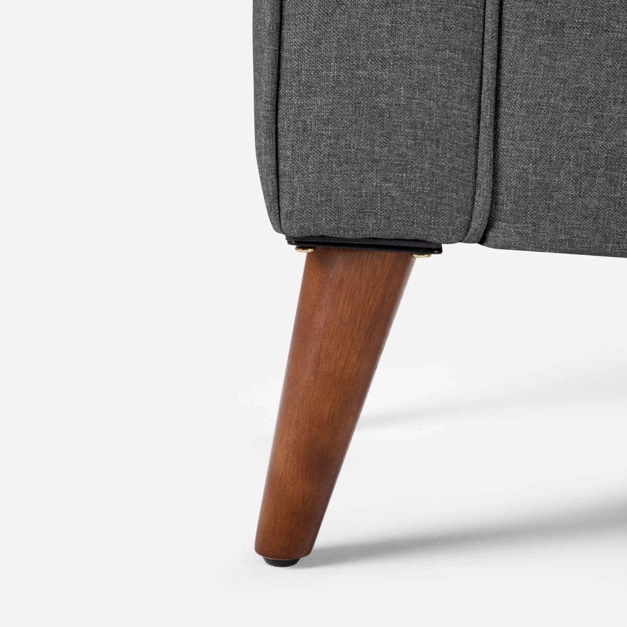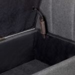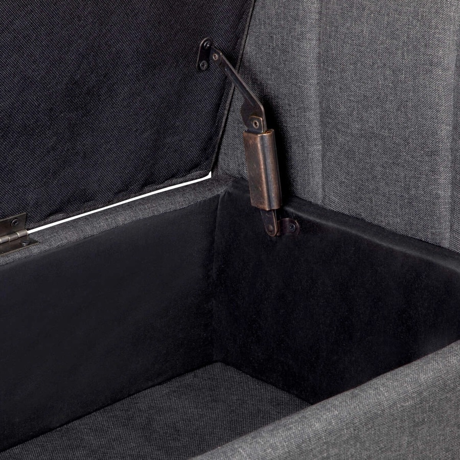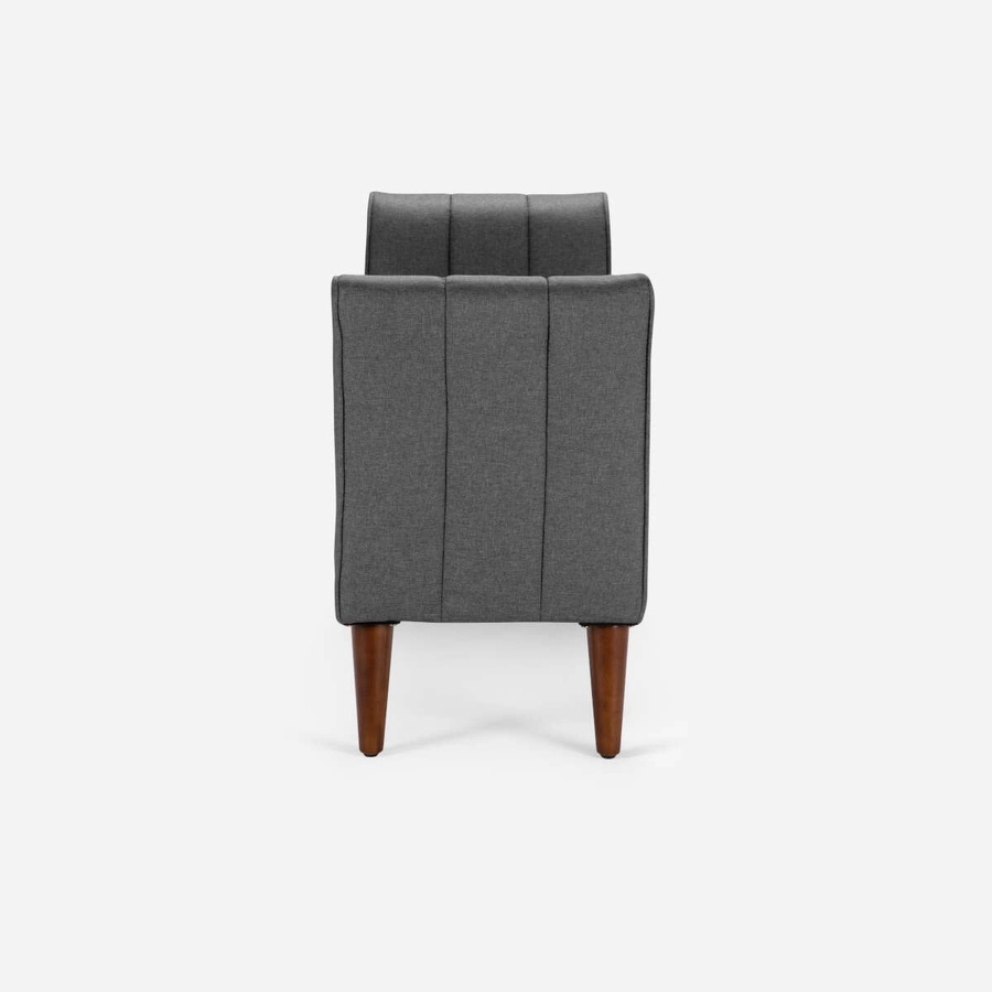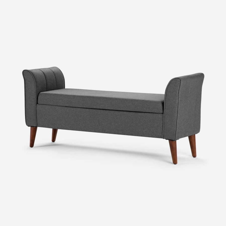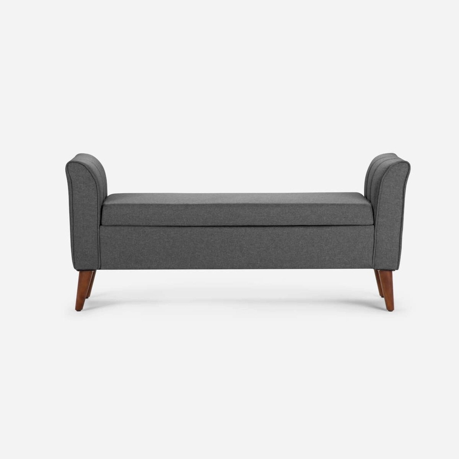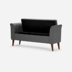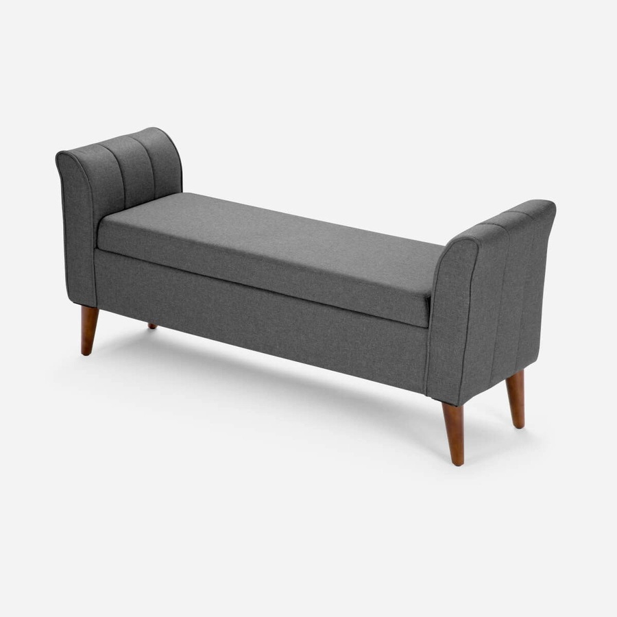 Confortable banca tapizada en tela, cuenta con brazos curvos. Posee una doble funcionalidad, ya que se pueden guardar objetos.